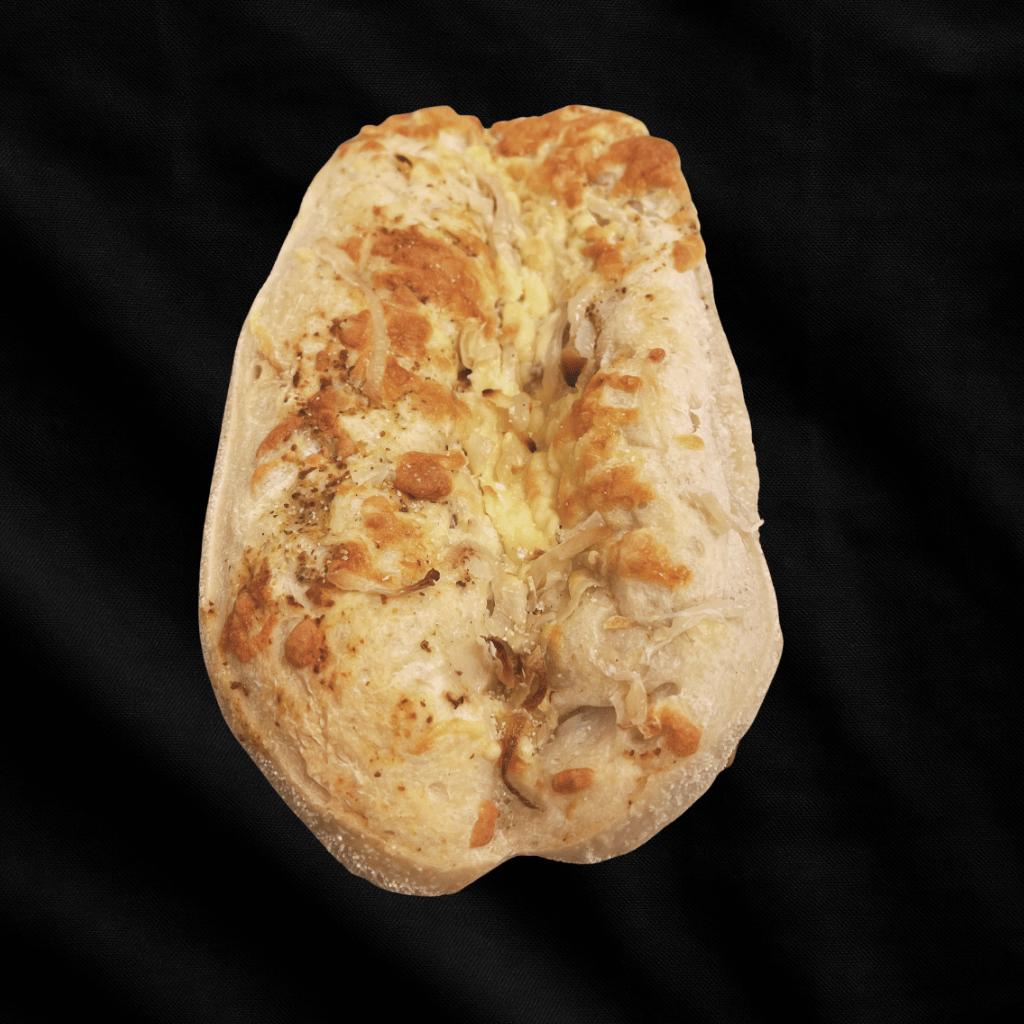 Bloem, desem, beetje gist, water, verse knoflook, mosterd, kaas, ui en zout.